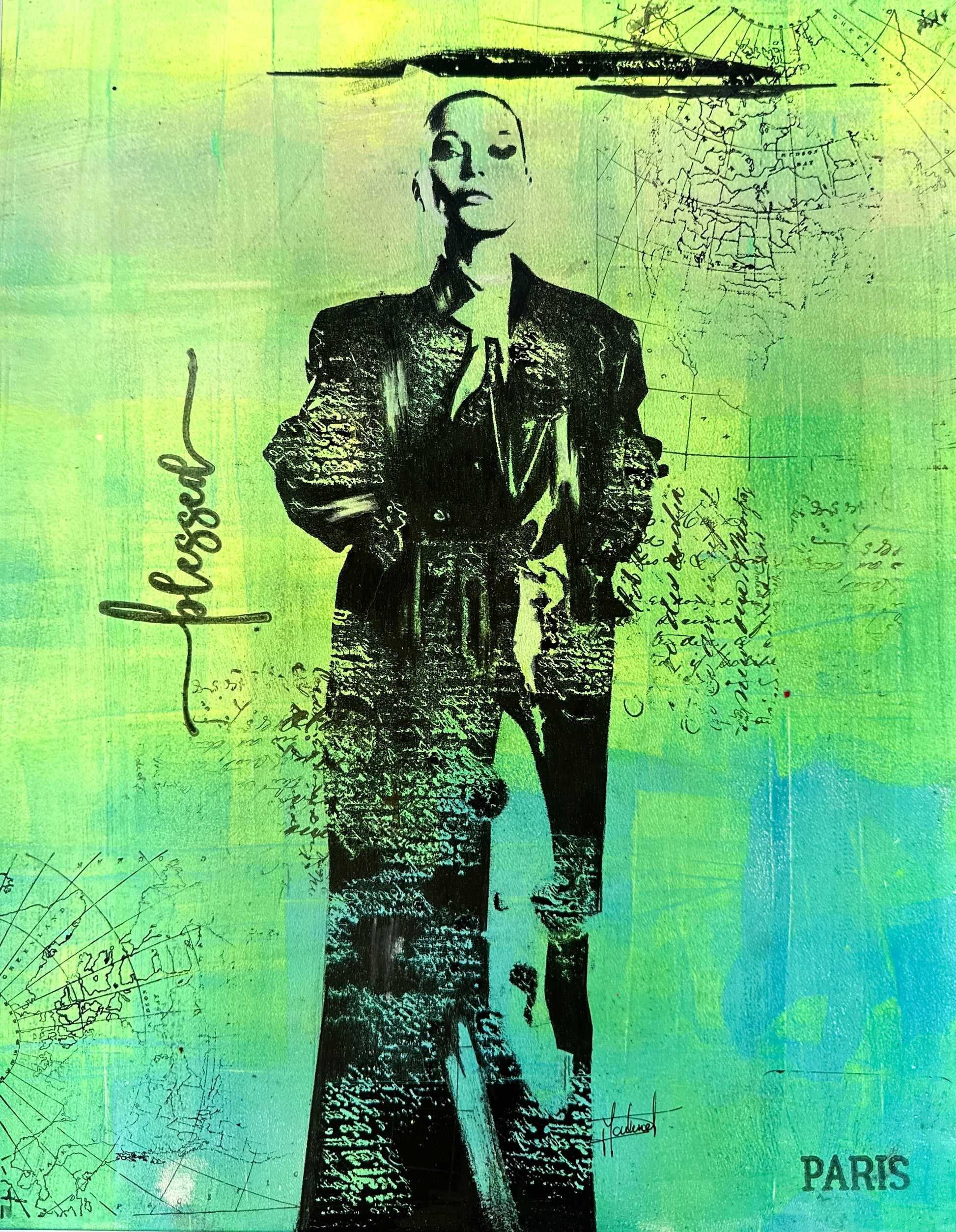 Mixed-media artwork combining printing with acrylic paint, drawing, collage, and stencil techniques to reinterpret a photographic reference. The original image is transformed through layered fading effects, textures, and symbolic alterations characteristic of the Faded Souls series.